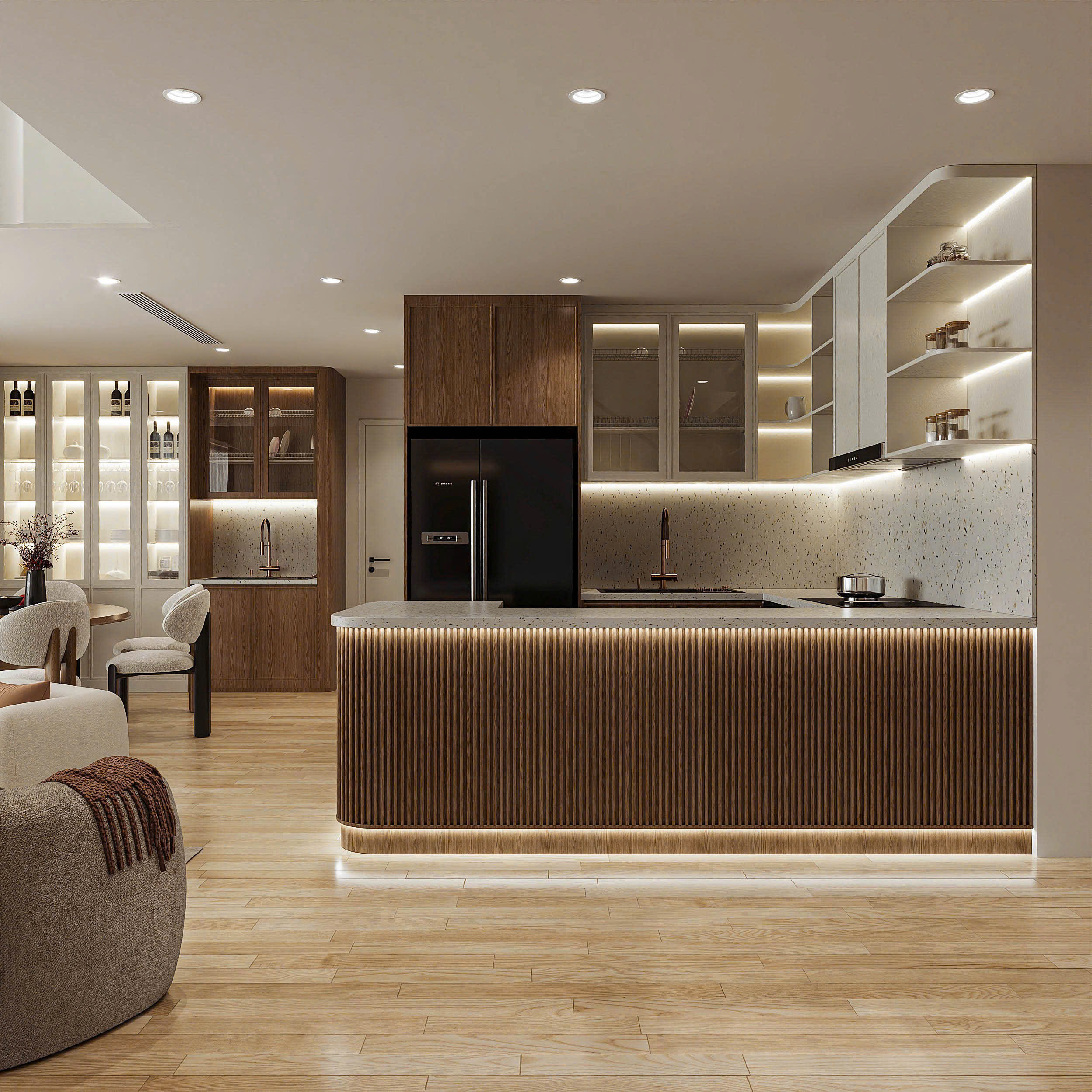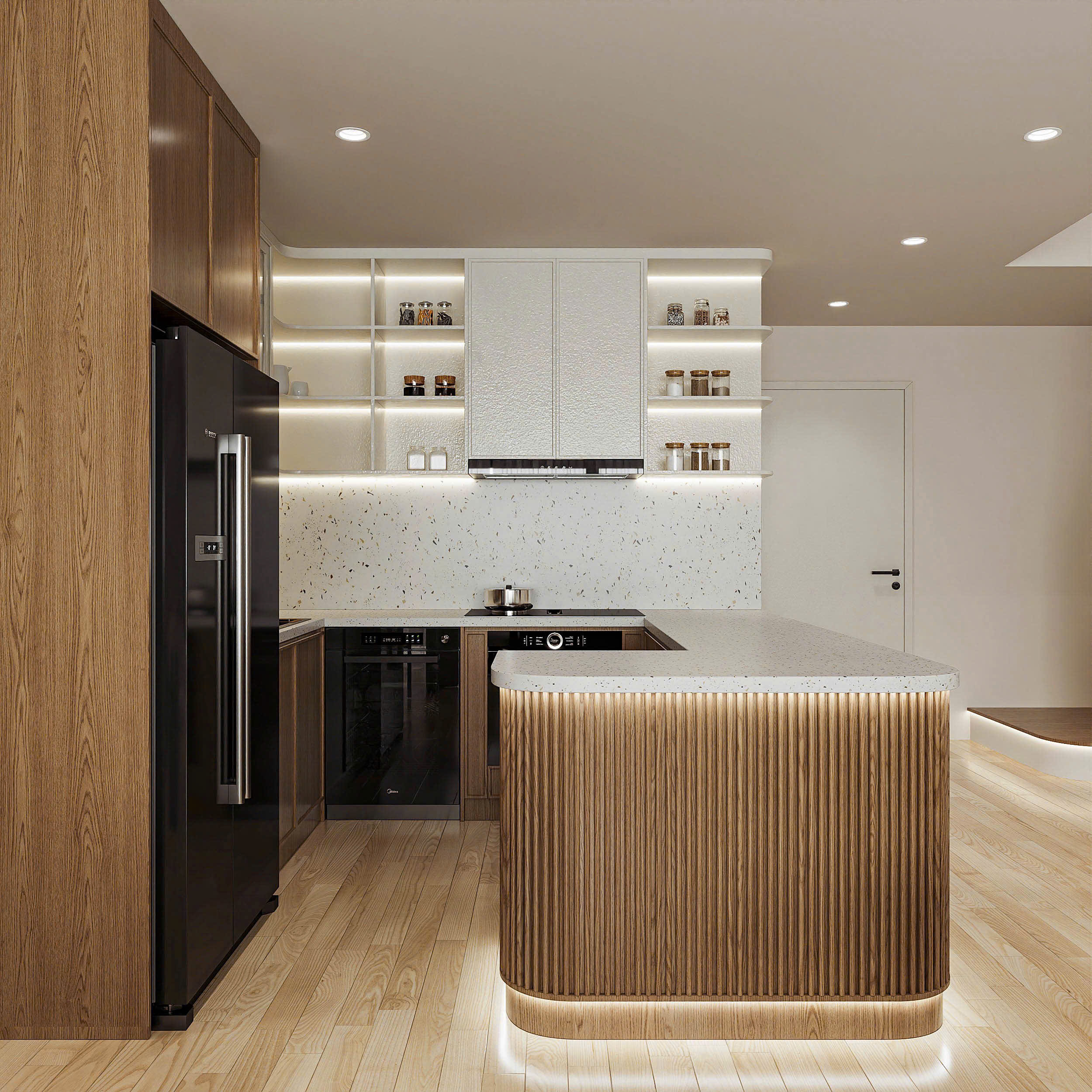 • Bếp chữ L hoặc chữ U tối ưu diện tích.